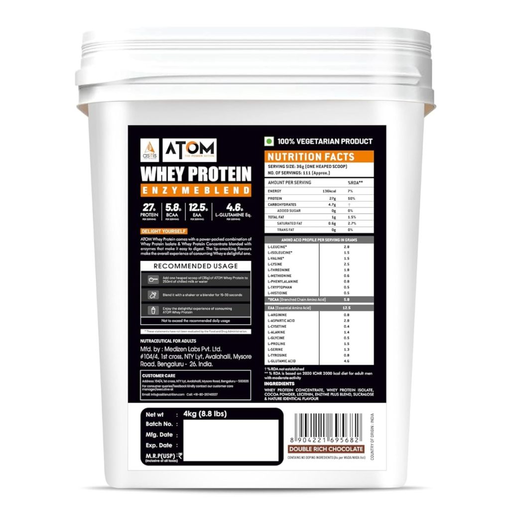 Mix 1 scoop (approx. 32g) of As-It-Is Atom Whey with 200–250ml of cold water or milk. Shake well in a shaker or blend for a smooth, chocolatey drink. For best results, consume within 30 minutes post-workout or between meals.