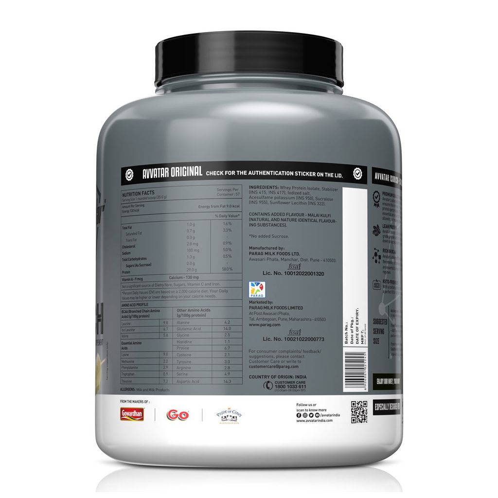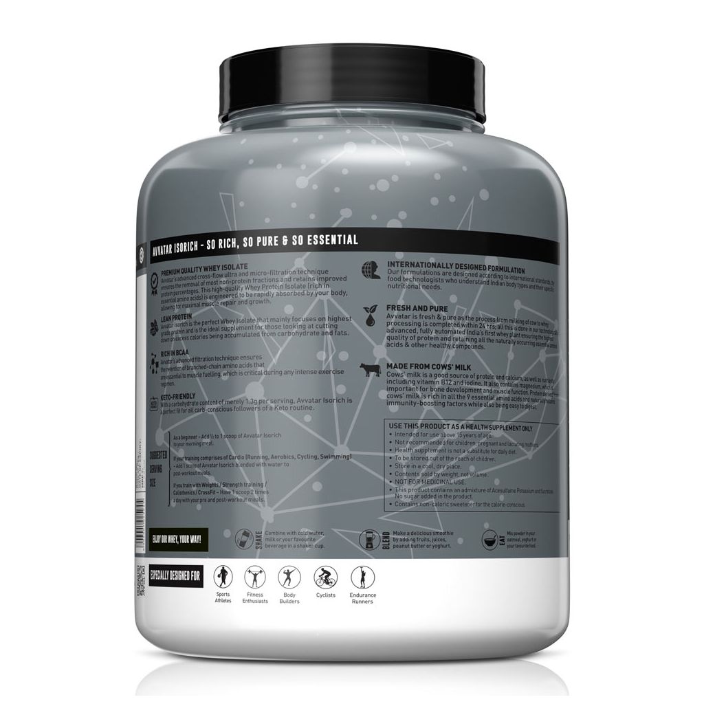 Avvatar IsoRich Whey Protein Isolate Belgian Chocolate is formulated for rapid protein delivery and superior muscle support, making it a preferred choice for athletes and regular users seeking pure, efficient supplementation. With 29g protein per 33g scoop, this protein powder features a high-purity whey isolate for maximum absorption, helping meet daily protein goals and accelerate recovery after intense activity.