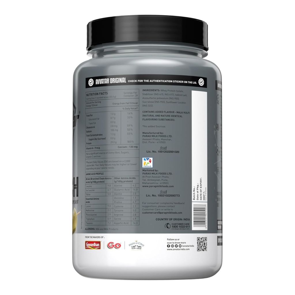 Avvatar IsoRich Whey Protein Isolate Malai Kulfi is crafted for quick muscle repair, lean muscle gains, and superior daily protein supplementation. With a strong 29g protein content per 35g scoop, it is among the most concentrated whey isolate formulas available in the Indian market. The protein is sourced only from fresh cow's milk, ensuring high biological value and rapid absorption, and the product retains valuable bioactive compounds alongside naturally occurring phospholipids for sustained nutrition benefits.