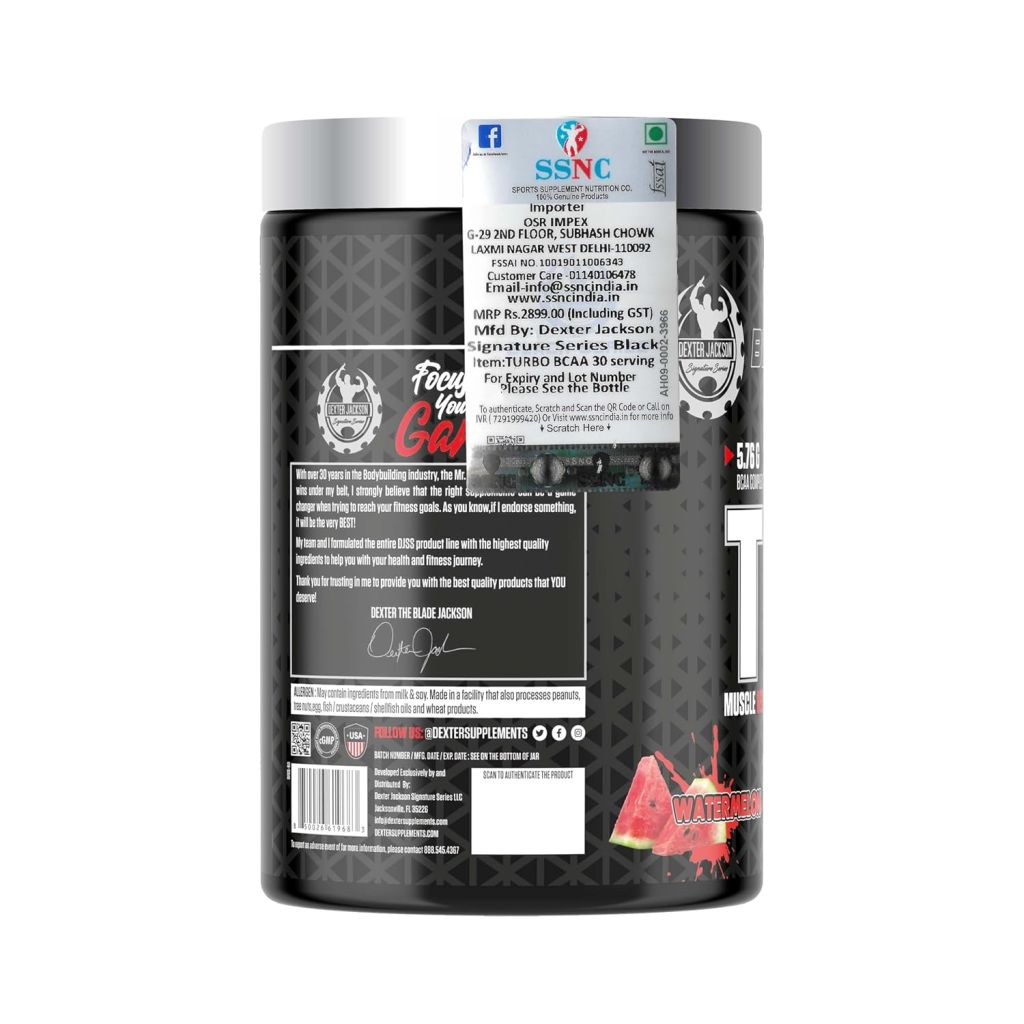 The Dexter Jackson Black Series Turbo BCAA is a next-generation amino acid supplement crafted for modern athletes and fitness enthusiasts who demand rapid recovery and sustained performance. Each 13g scoop contains a powerful blend of branched-chain amino acids, with 5.7g coming from L-Leucine, L-Isoleucine, and L-Valine in the proven 2:1:1 ratio. This optimal BCAA matrix helps initiate muscle protein synthesis, reduce muscle breakdown, and supports faster repair after strenuous sessions.