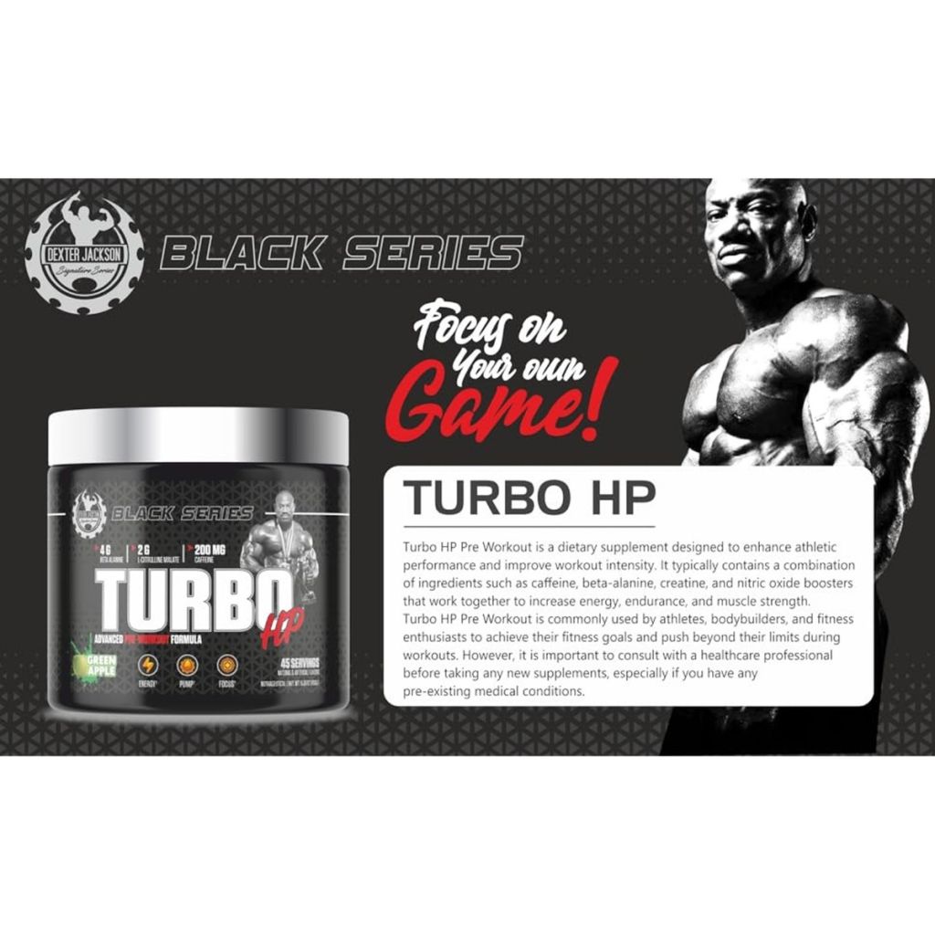 Black Series Turbo HP by Dexter Jackson is a premium pre-workout supplement formulated to maximize your workout performance through enhanced blood flow and oxygen delivery. This advanced pump enhancer supports nitric oxide (NO) production, helping you push harder, train longer, and recover faster. Whether you're an athlete, bodybuilder, or fitness enthusiast, Turbo HP can elevate your performance with noticeable muscle pumps and endurance gains.