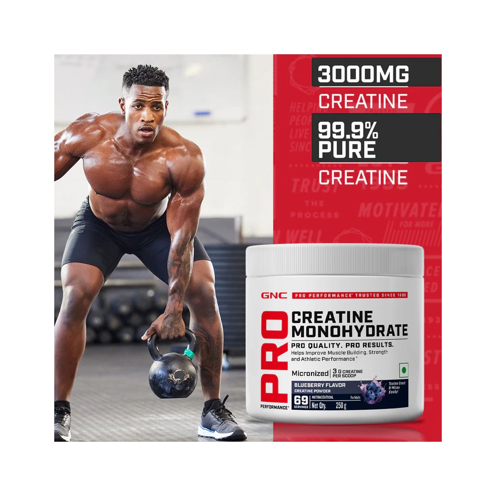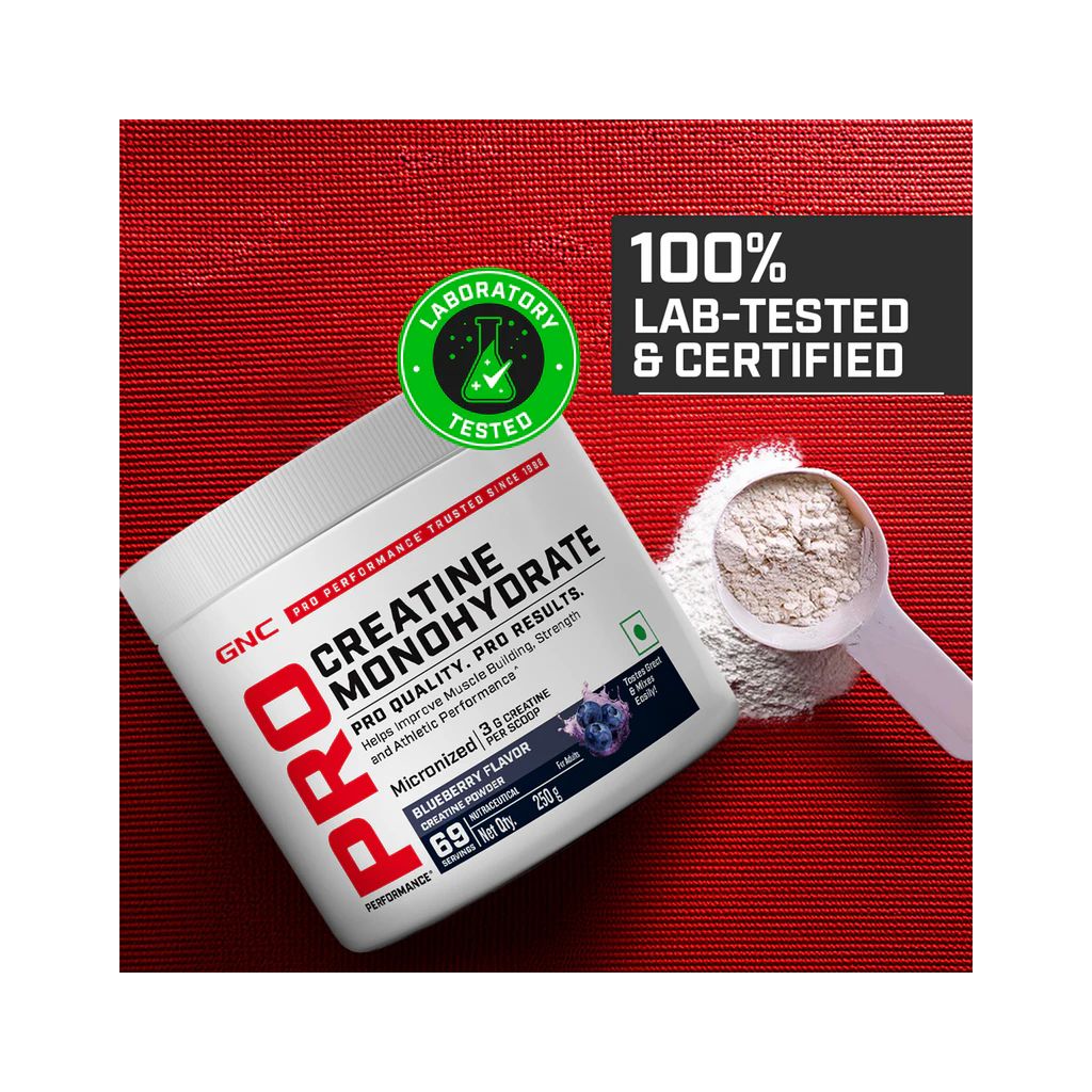 GNC Pro Performance Creatine Monohydrate Blueberry is scientifically crafted for those seeking muscle-building support, improved recovery, and enjoyable supplementation. The micronised formula uses advanced processing to produce a highly soluble powder that blends smoothly in water or shakes without leaving grittiness or aftertaste.