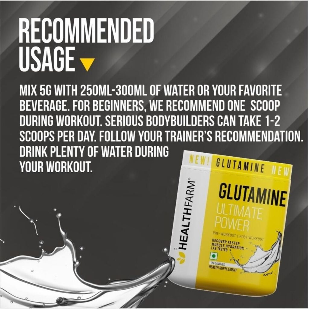 Mix 5g of Healthfarm Glutamine Powder with 250ml–300ml of water or your favorite beverage.