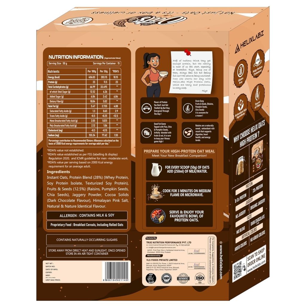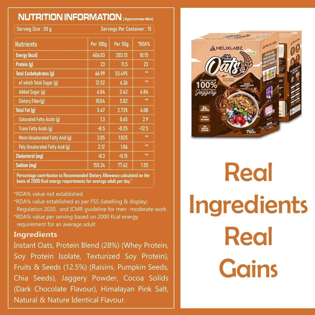 Suitable for gluten-sensitive individuals, the oats are free from preservatives, artificial colors, and flavors. The transparency of ingredients and premium quality process make Helixlabz Labz High Protein Oats a trustworthy choice for clean, balanced nutrition.
