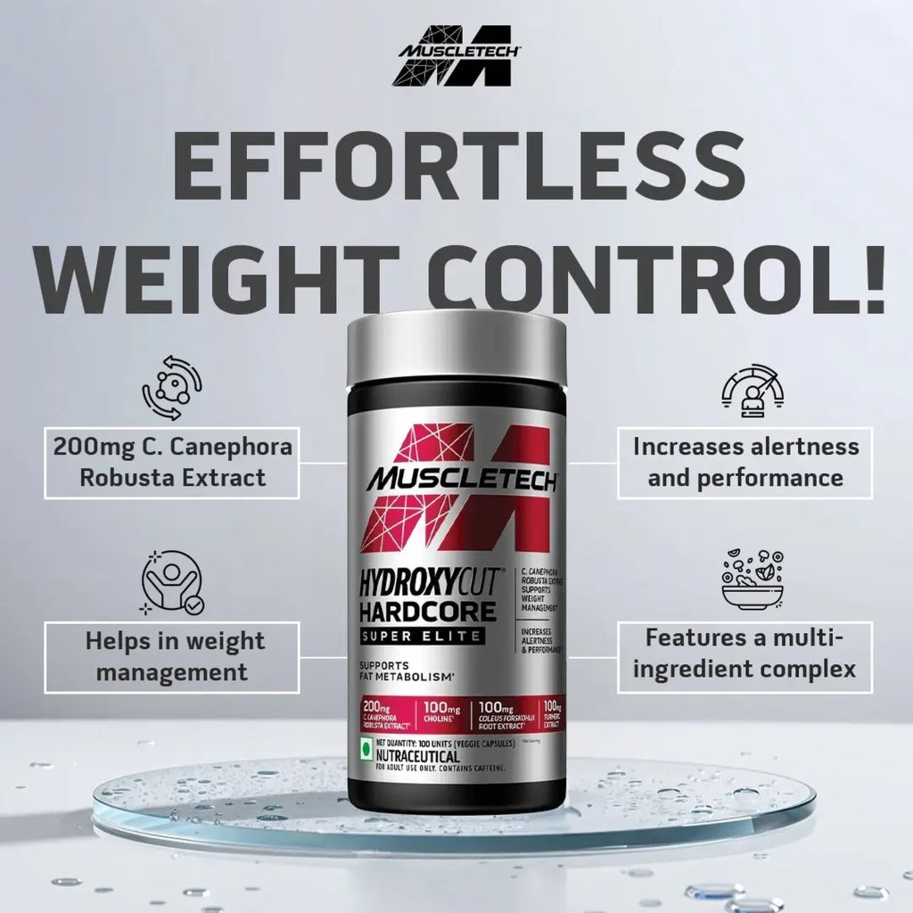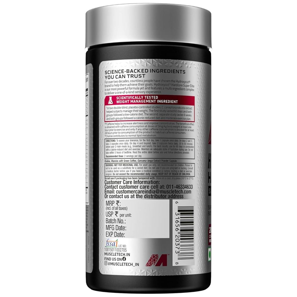 MUSCLETECH Hydroxycut Hardcore Super Elite combines an 80% Super Elite Botanical Plus Blend formulated with caffeine anhydrous and robusta coffee bean extract to promote thermogenesis, increase calorie burning, and support weight loss. This scientifically researched formula helps accelerate fat metabolism and provides enhanced energy for intense physical activity and mental focus.