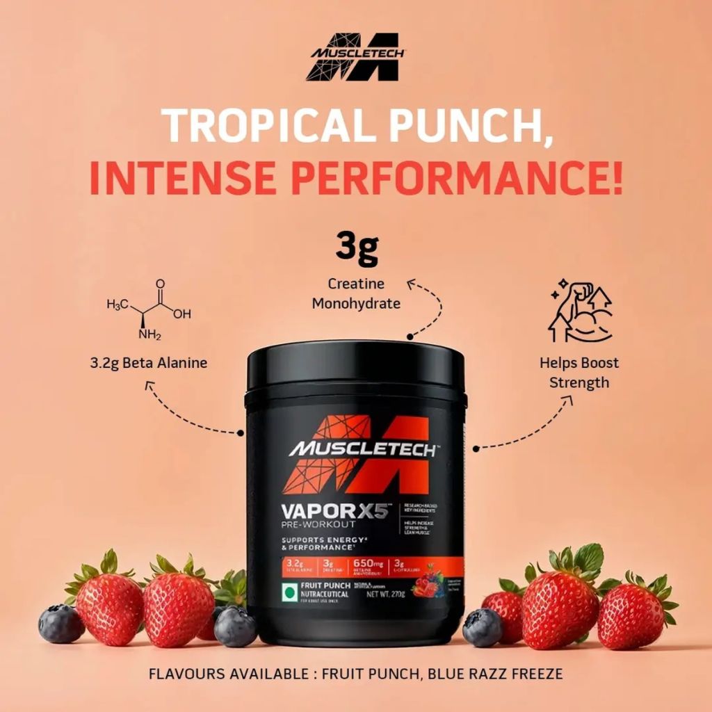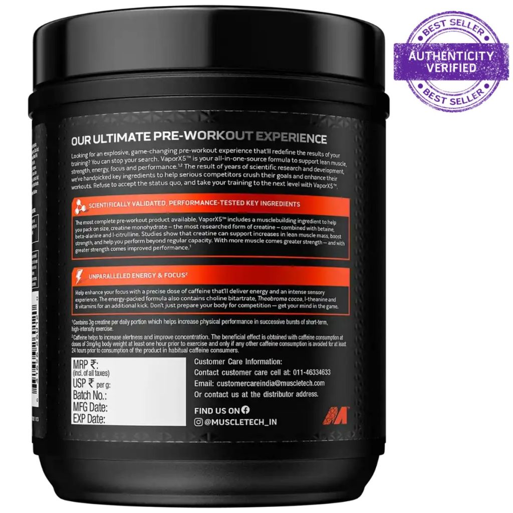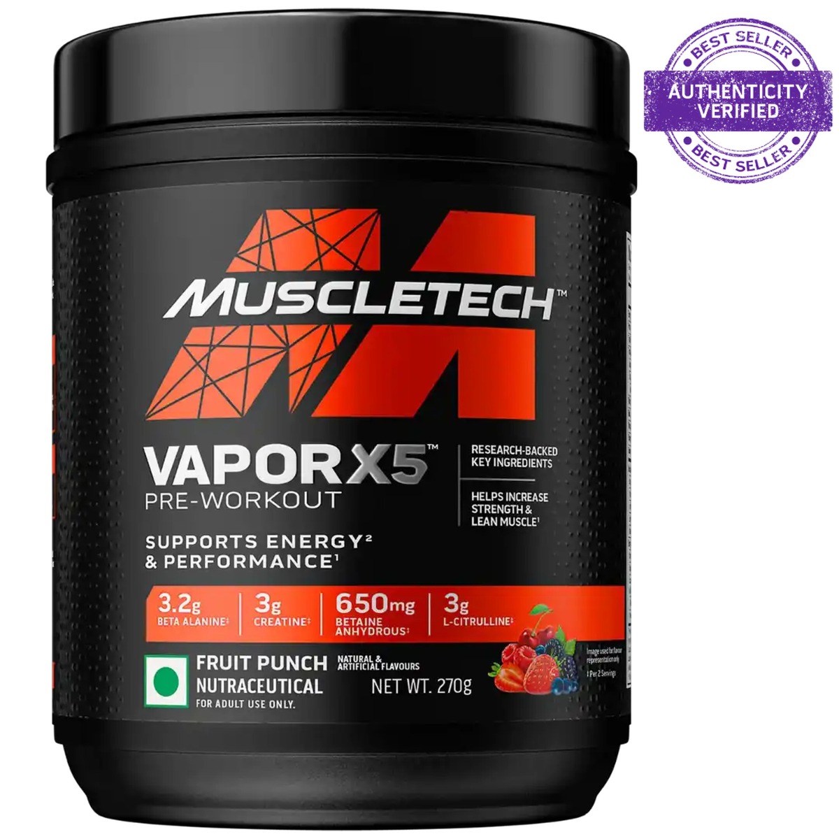 Revolutionize your training with MuscleTech Vapor X5 Next Gen Pre-Workout, the ultimate performance-enhancing supplement designed for serious athletes. This powerful 300g Fruit Punch formula delivers a scientifically engineered blend of 275mg caffeine, 6g L-Citrulline, and 3g Creatine Monohydrate to transform your workout intensity, mental focus, and overall athletic performance. Developed by leading sports nutritionists, Vapor X5 provides a cutting-edge solution for fitness enthusiasts seeking to break through their performance barriers and achieve extraordinary results.