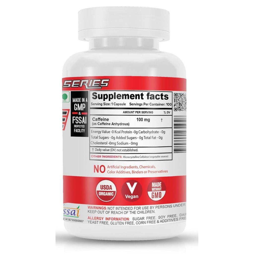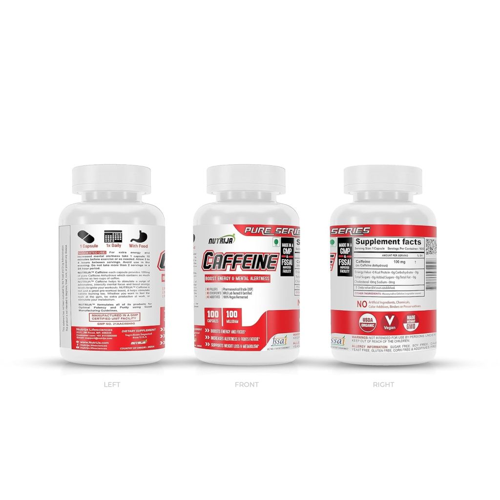 NUTRIJA Caffeine 100mg utilizes pure caffeine anhydrous in pharmaceutical and USP grade quality, ensuring maximum potency and bioavailability. Each capsule delivers precisely 100mg of caffeine, equivalent to approximately two cups of coffee, providing consistent and reliable energy enhancement without the variability of traditional caffeine sources like coffee or energy drinks.