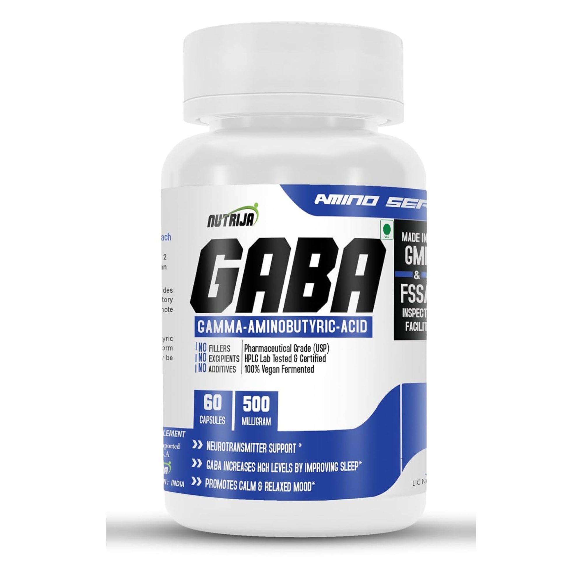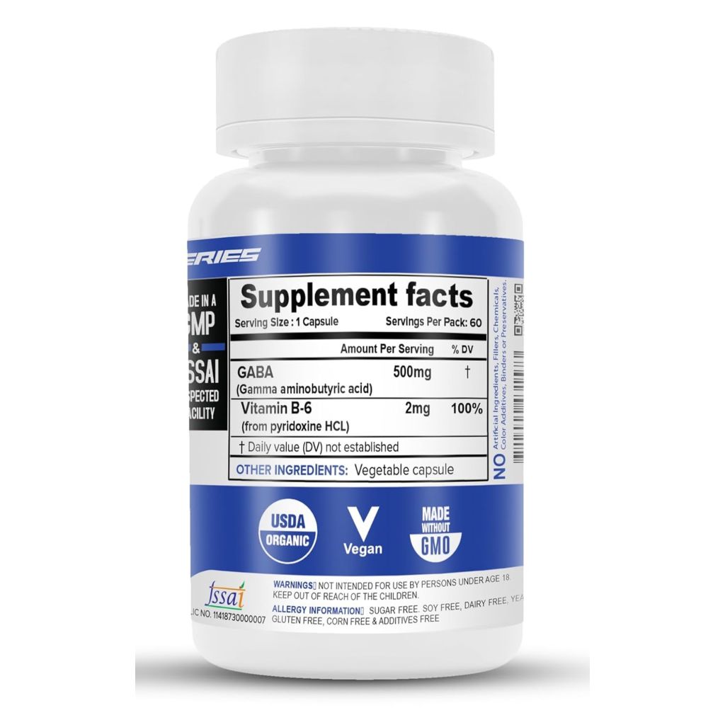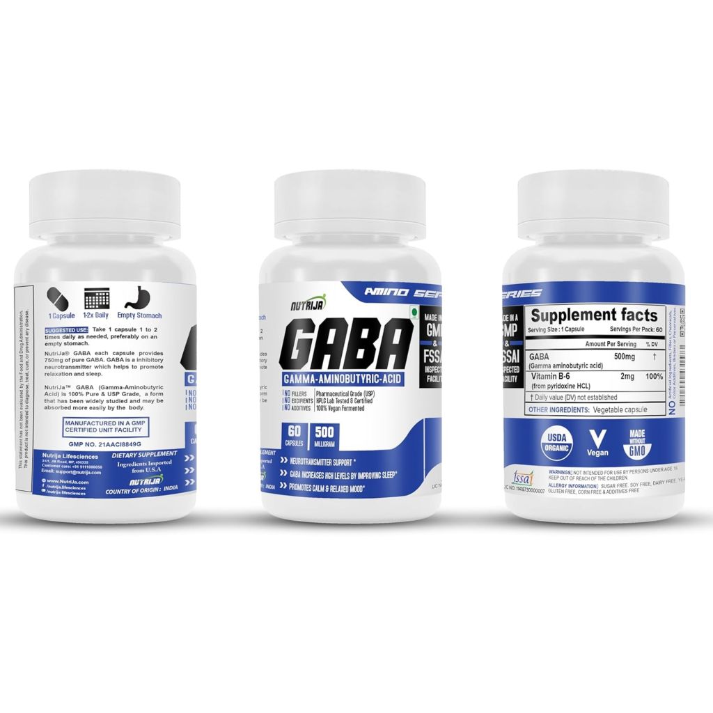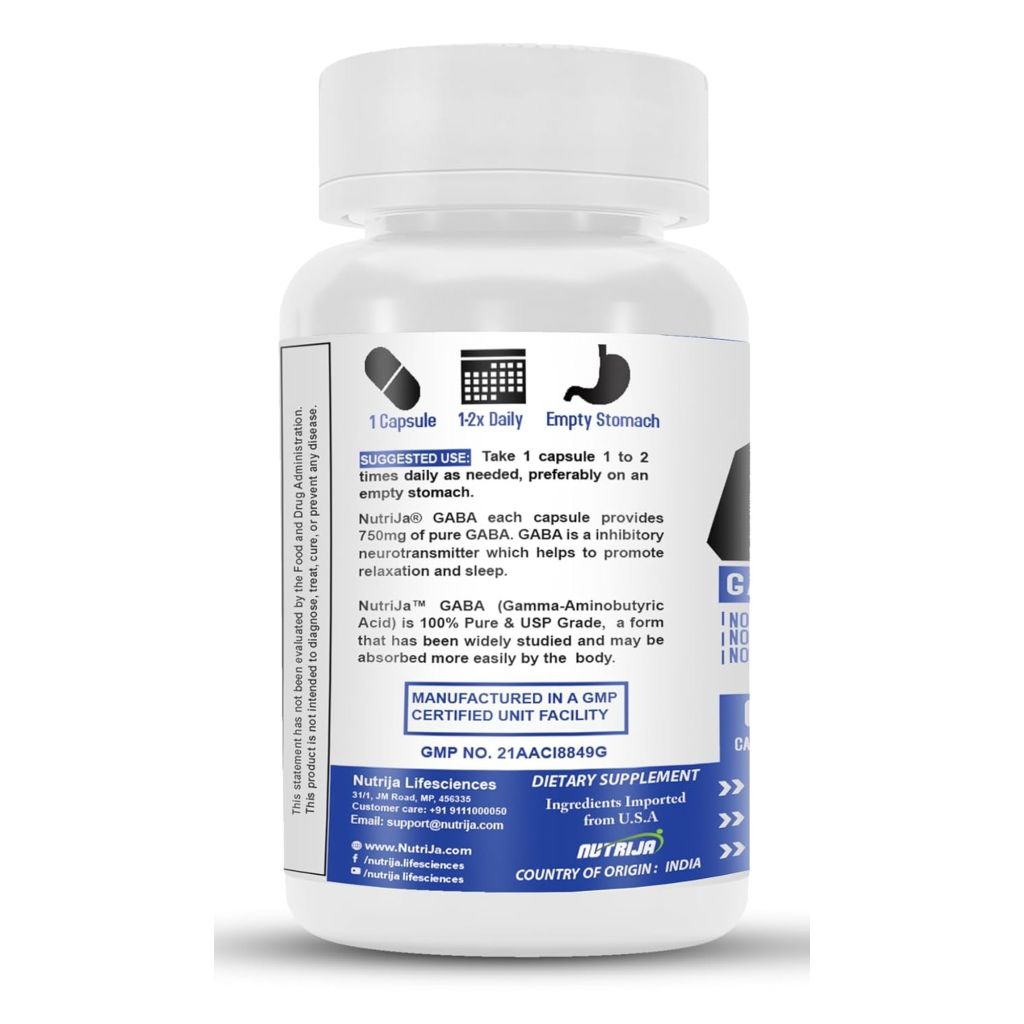 NUTRIJA GABA 500mg delivers a high-potency dose of pure gamma-aminobutyric acid, the primary inhibitory neurotransmitter in the central nervous system, to promote relaxation, stress relief, and restful sleep. Each capsule provides 500mg of pharmaceutical-grade GABA that crosses the blood–brain barrier to support healthy neurotransmitter balance and calmness. This supplement aids in reducing anxiety and muscle tension while improving focus, mood stability, and cognitive clarity. Crafted in GMP-certified FSSAI facilities using vegan-friendly ingredients, NUTRIJA GABA undergoes rigorous third-party testing for purity and potency. Ideal for individuals experiencing daily stress, sleep disturbances, or post-exercise tension, this supplement offers science-backed support for mental and physical relaxation. Consistent use helps maintain balanced GABA levels essential for optimal neural function and well-being in demanding modern lifestyles.