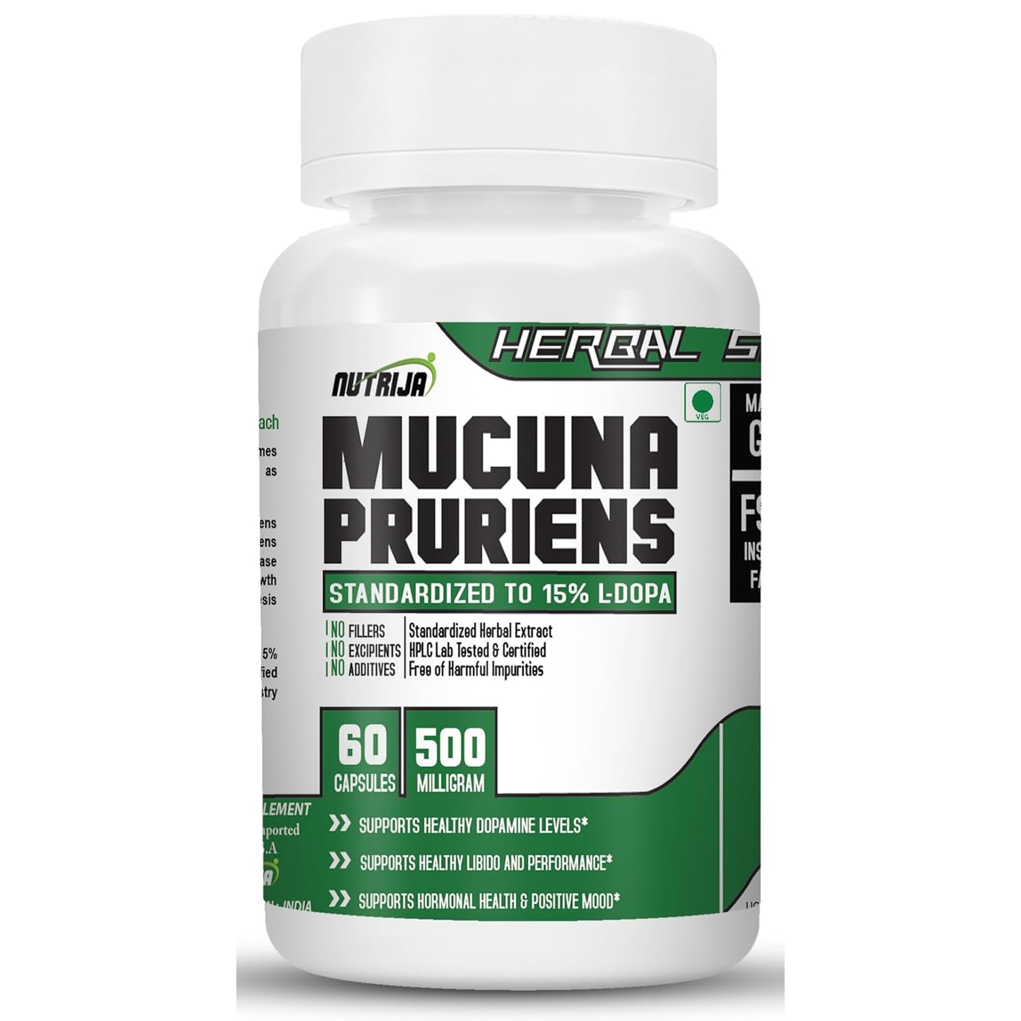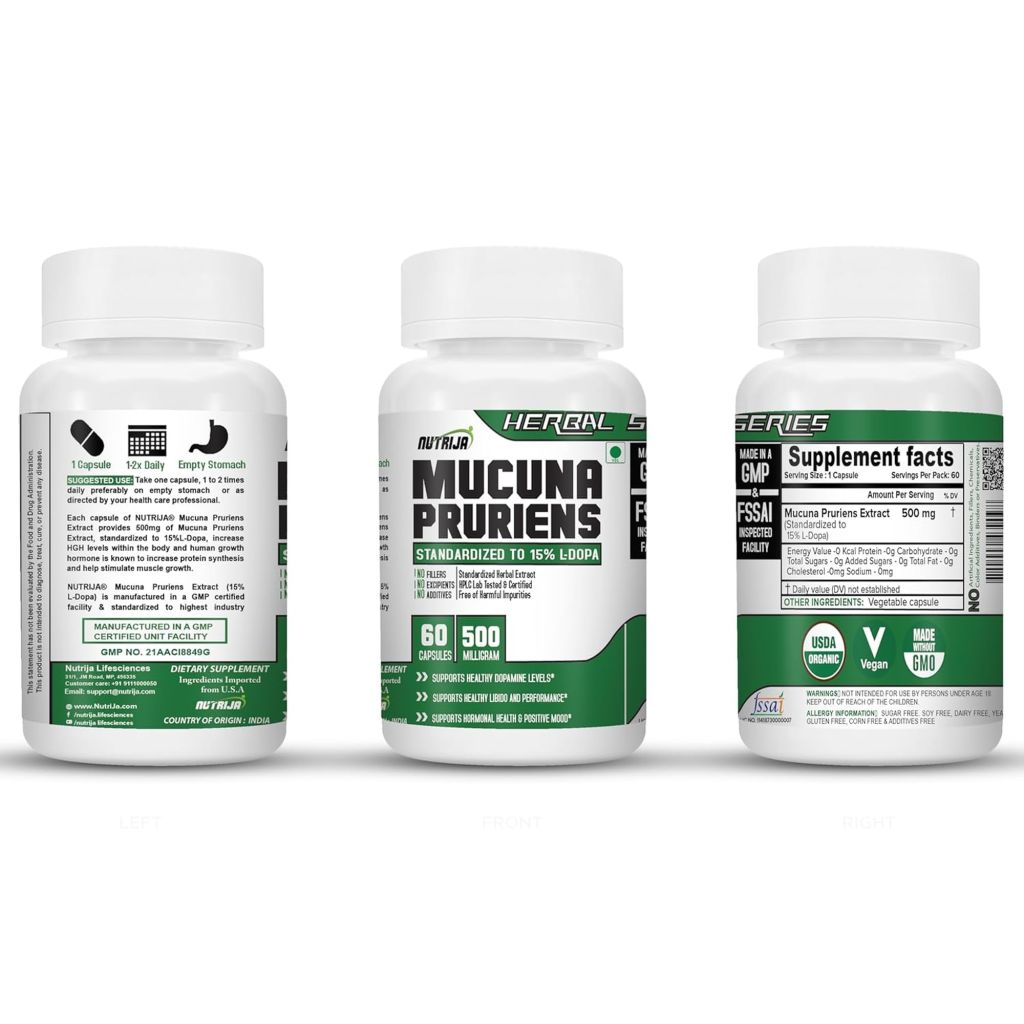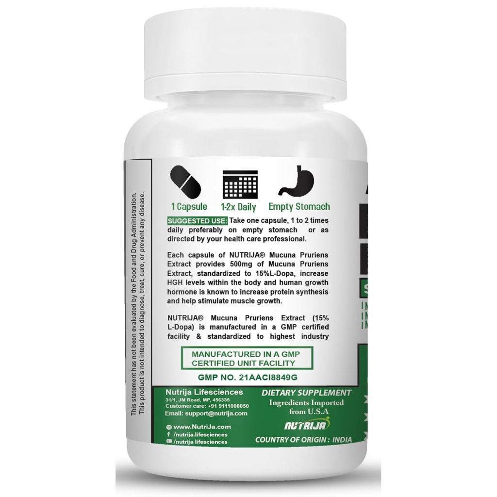 NUTRIJA Mucuna Pruriens Extract 500mg delivers a potent, standardized dose of L-Dopa, the biochemical precursor to dopamine essential for healthy mood and cognitive function. Each capsule provides 500mg of premium Mucuna Pruriens extract standardized to 15% L-Dopa, supporting optimal neurotransmitter synthesis and balanced dopaminergic activity. This traditional Ayurvedic herb promotes mental clarity, stress relief, and emotional stability while enhancing libido and overall vitality. Additionally, Mucuna’s dopaminergic properties support motor coordination and healthy neurological function, making it beneficial for age-related cognitive maintenance. Manufactured in GMP-certified FSSAI facilities using vegan-friendly ingredients, this supplement undergoes rigorous third-party testing to ensure accurate L-Dopa content, purity, and safety. Ideal for individuals seeking natural mood support, cognitive enhancement, and hormonal balance, NUTRIJA Mucuna offers science-backed nutrition for comprehensive well-being in demanding modern lifestyles.
