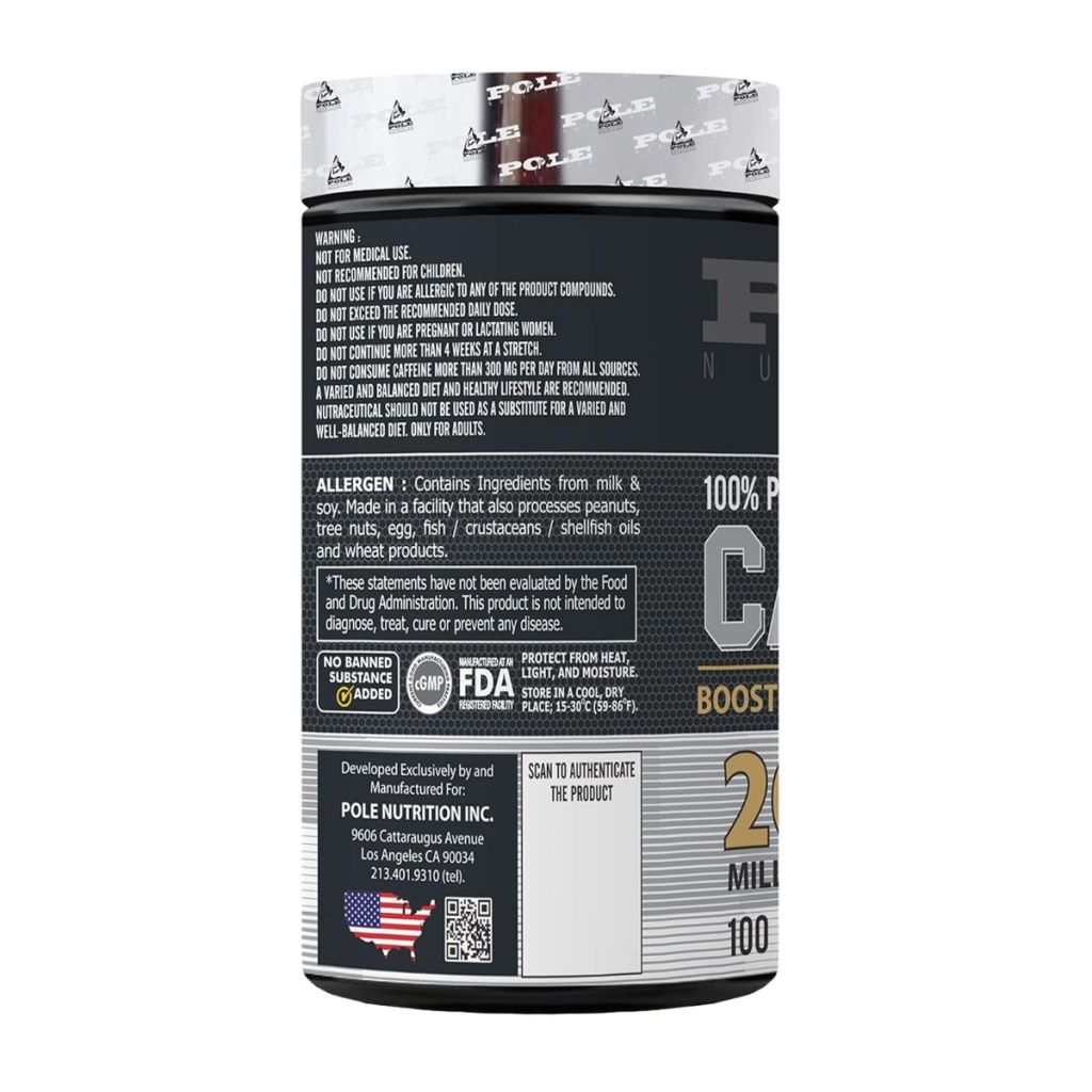 POLE NUTRITION's 100% Pure Caffeine Capsules offer an effective and convenient way to boost energy and improve performance. With zero added sugar or calories, it supports your training goals without compromising your dietary needs. Caffeine’s performance-specific benefits include increased focus, alertness, reaction time, endurance, and reduced fatigue.