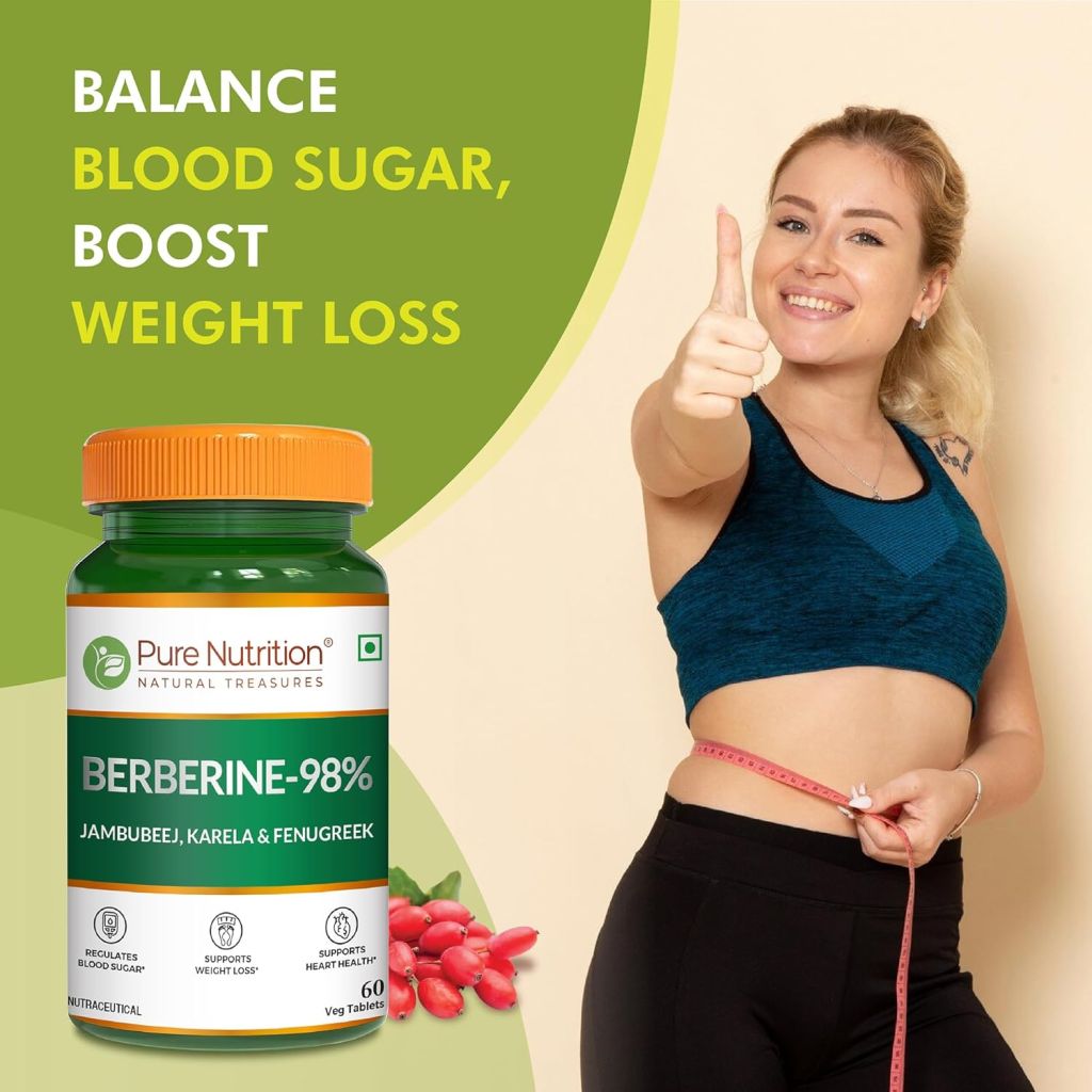 Pure Nutrition Berberine with Cinnamon & Chromium offers a synergistic blend of high-purity berberine extract (98%), cinnamon, and chromium picolinate, combined with Ayurvedic botanicals like Jamun, Karela, and Fenugreek. Each tablet helps regulate blood sugar, support healthy carbohydrate metabolism, and promote cardiovascular wellness. With only 0.2 Kcal per serve and zero added sugars or fats, it fits seamlessly into mindful, active lifestyles. Free from artificial additives and suitable for vegetarians, this supplement is crafted for easy, everyday use. Ideal for those aiming to maintain healthy glucose levels, manage weight, and support overall metabolic and heart health.
