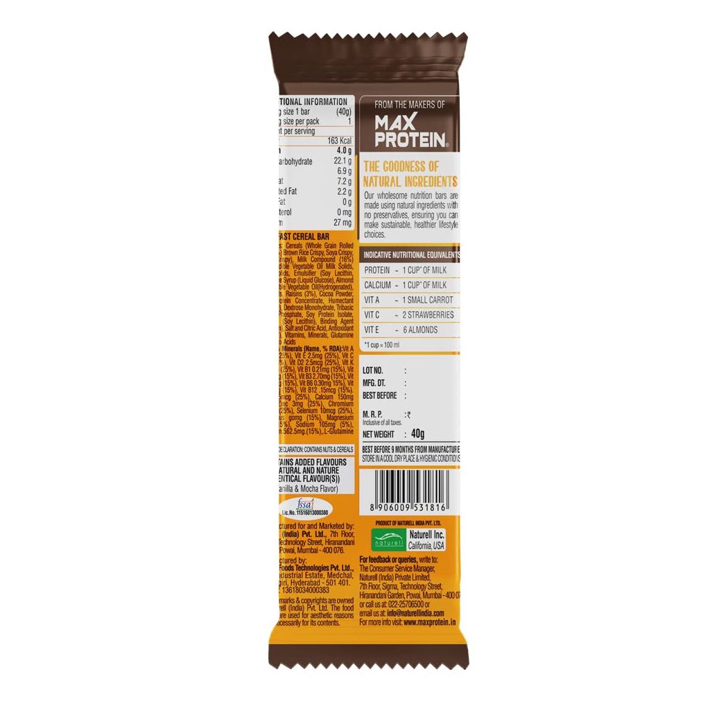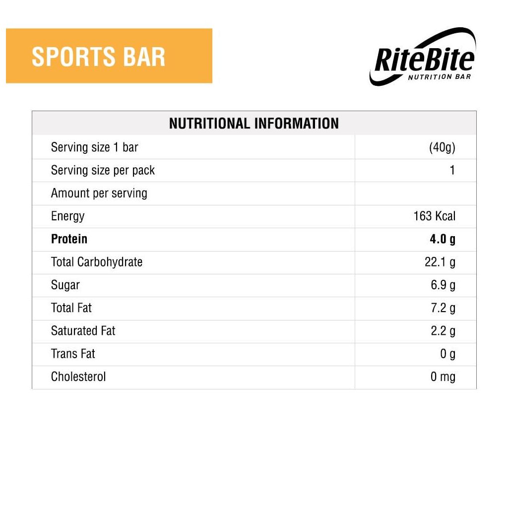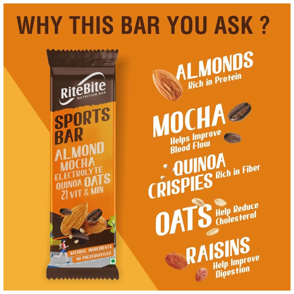 The RiteBite Max Protein Sports Bar Almond Mocha is a 40g energy bar combining the rich flavors of roasted almonds, robust mocha, and dark chocolate. Specially designed for rapid energy release, it is packed with natural ingredients such as peanuts, oats, quinoa, and bran, along with essential electrolytes to replenish lost minerals during workouts. This preservative-free, sugar-free vegetarian bar helps support post-exercise recovery while providing sustained energy for all-day activities. Its convenient format makes it an ideal companion for sports, workouts, travel, or as a smart, gut-friendly snack between meals.