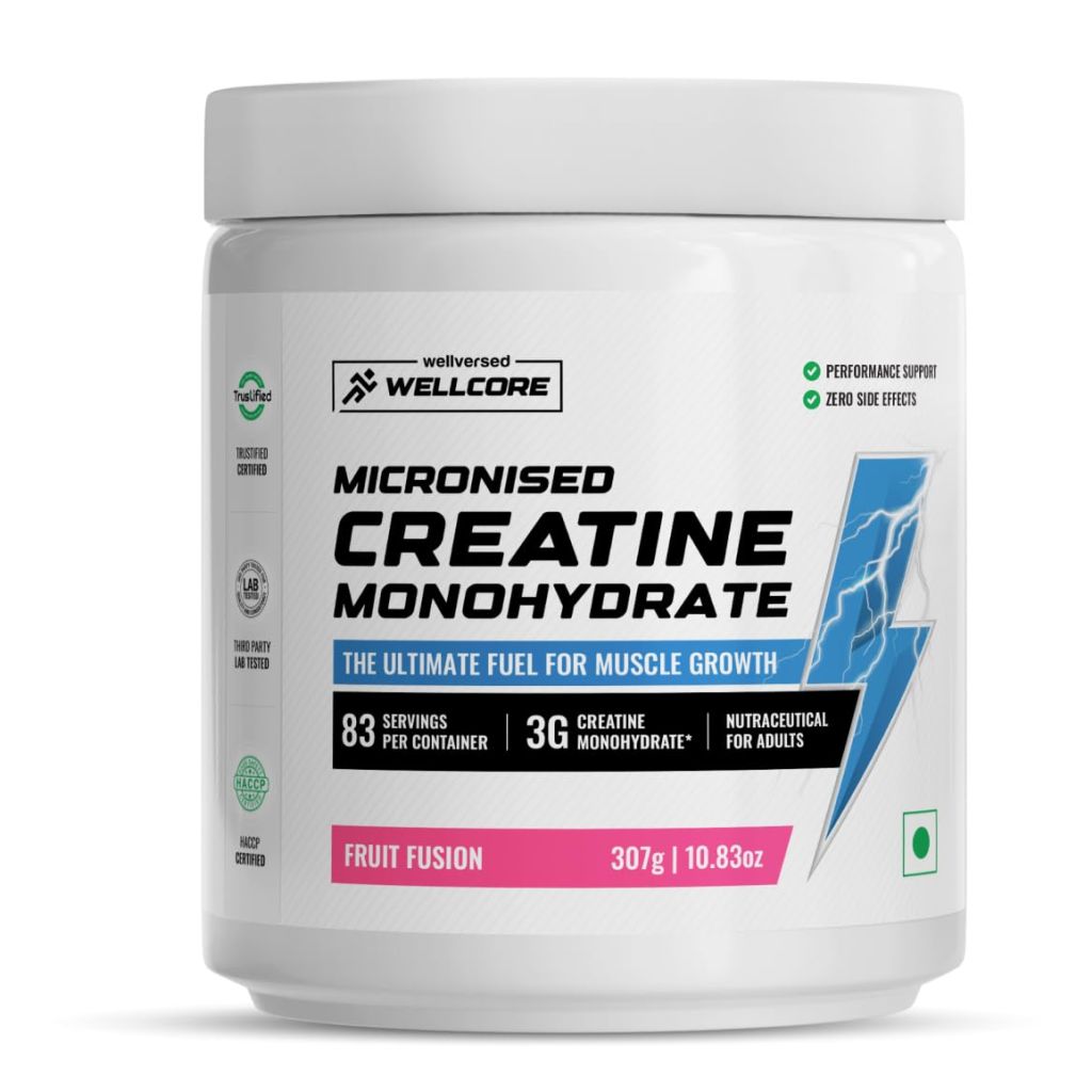 Wellcore Pure Micronised Creatine Monohydrate Fruit Fusion delivers 3g of high-quality creatine per serving in a tasty blend of guava, green apple, and pineapple. This micronised powder ensures faster absorption and easy mixability, making it suitable for pairing with water or your favourite beverage. The lab-tested, Trustified-certified supplement contains zero sugar, fillers, or banned substances, helping athletes and fitness enthusiasts build muscle, boost strength, improve workout recovery, and train with consistent energy. The pleasant Fruit Fusion flavour makes daily supplementation easy and enjoyable for all users—vegetarian and clean label compliant.